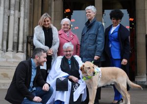 At the annual Good Samaritans Service at Belfast Cathedral on February 3, are, from left: Lynda Bryans, special guest; Peter Kernoghan, No More Traffik; Dean Stephen Forde; Diane Marks, Guide Dogs NI with Morris; Kathleen McGarrity, Colmcille Senior Citizens Club, Omagh, and Carolyn Stewart, Youth Lyric. Two hundred and twenty charities received grants totalling £168,000 raised at the Christmas 2018 Black Santa Sit-out.