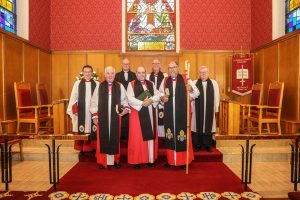 At the Service of Institution of the Rt Rev Darren McCartney as rector of St Paul’s, Lisburn, On September 7 are, front row from left: The Rt Rev David McClay, Bishop of Down and Dromore, preacher; the Rt Rev Darren McCartney and the Rt Rev George Davison, Bishop of Connor. Back row, from left: The Ven Paul Dundas, Archdeacon of Dalriada; the Rev Canon William Taggart, Registrar; the Ven Dr Stephen McBride, Archdeacon of Connor; and the Rev Nicholas Dark, Rural Dean. Photo: Norman Briggs.