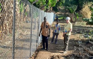 At the security fence for Yei Vocational Training College, in South Sudan, funded with help from Bishops’ Appeal are Morris Logulomo, manager, Tom Finlay from St John’s Parish, Moira, and Baraka, an instructor from the college. Photo credit: CMS Ireland.
