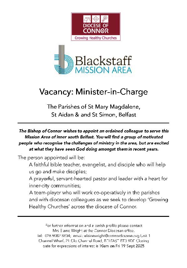 Vacancy for minister-in-charge, Blackstaff Mission Area