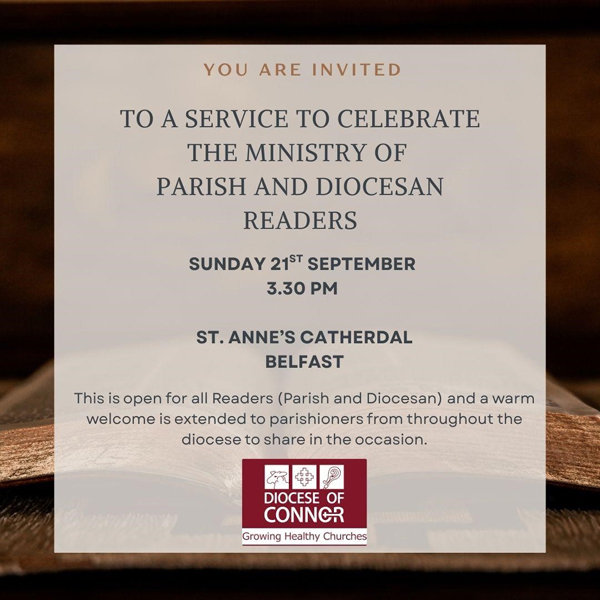 A service will be held in Belfast Cathedral on Sunday September 21 at 3.30pm celebrating the ministry of Parish and Diocesan Readers.