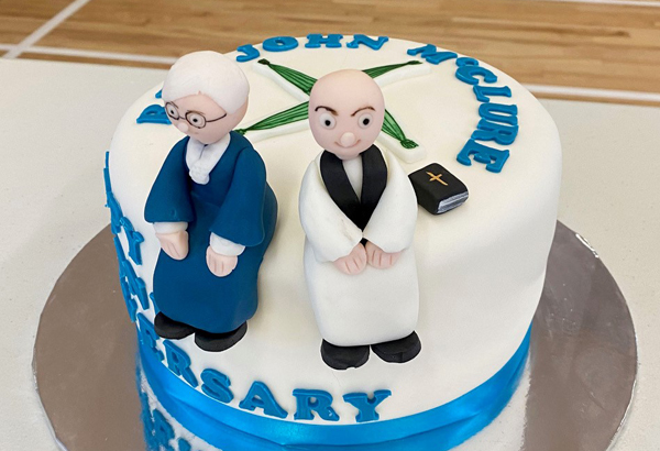 Celebration cake featuring the Rev John McClure and his wife Margo, who sings in the Kilbride Parish Choir.