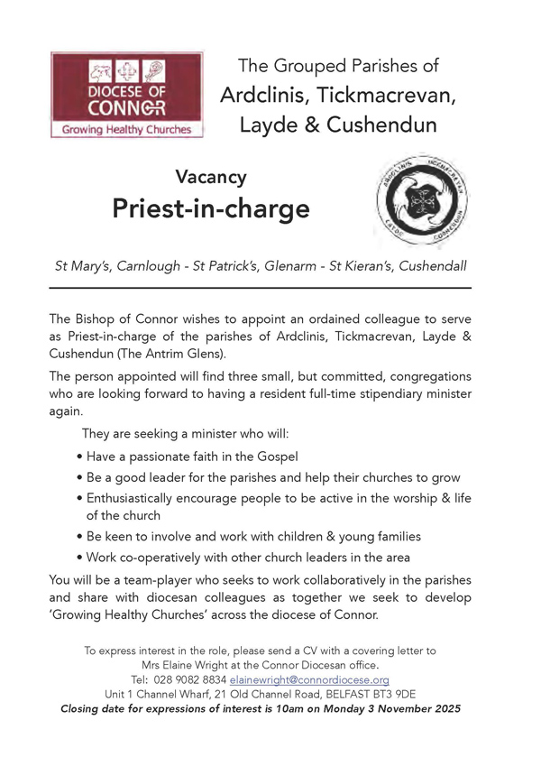 We have a vacancy for a Priest-in-Charge of The Grouped Parishes of Ardclinis, Tickmacrevan, Layde & Cushendun. Closing date for expressions of interest is Monday November 3.