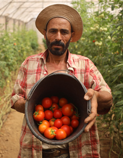 Imad Al-Muanni shows off some of the tomatoes he has grown in his greenhouse in Gaza, with support from Christian Aid. Credit: Majdi Fathi/Christian Aid