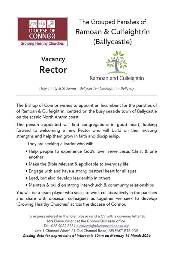 We have a vacancy for a rector in the Grouped Parishes of Ramoan and Culfeightrin, Ballycastle. Full details below.