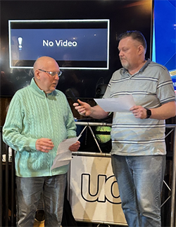 Rev Peter Blake conducts an interview during the Blend breakfast.