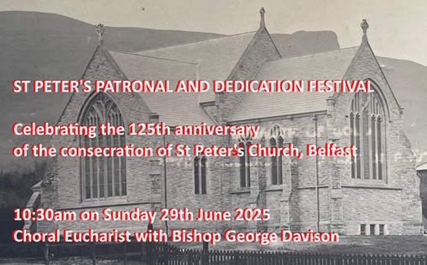 Sunday June 29 is both St Peter’s Day and the 125th anniversary of the consecrationof St Peter’s Church. It is therefore our patronal and dedication festival, and we welcome all who have a past or present connection to St Peter’s to join us as we give thanks for all that God has given us. And we will always gladly welcome anyone who has never worshipped with us before!